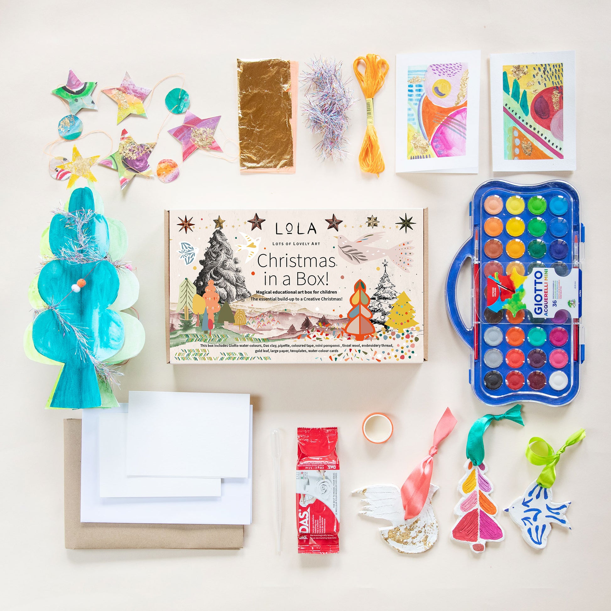 - Plenty of quality art materials for your child: This box includes a set of Giotto water-colours, Das clay, a pipette, coloured tape, mini pompoms, tinsel wool, embroidery thread, gold leaf, large paper, templates and water-colour cards